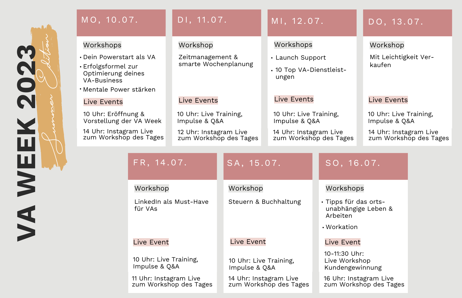 Nach den grandiosen Virtual Assistant Weeks 2021, 2022 & 2023 mit knapp 3000 Anmeldungen starten wir eine VA Week SUMMER EDITION im Juli 2023.